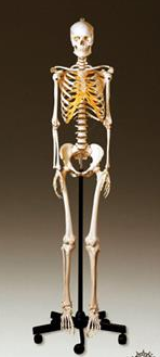 One of our highest quality skeletons, this adult female skeleton is cast from the bones of a natural skeleton. This life size finely detailed skeleton shows all of the anatomical details of the bone structure, including a rounded, less pronounced ilium as the key female landmark. The skull has a removable calvarium and mandible. All of the joints are articulating and moveable. All extremities may be removed from the skeleton for closer inspection. The right and left foot can be detached from the leg. Mounted upright on a roller stand. Includes a dust proof cover and rolling stand.