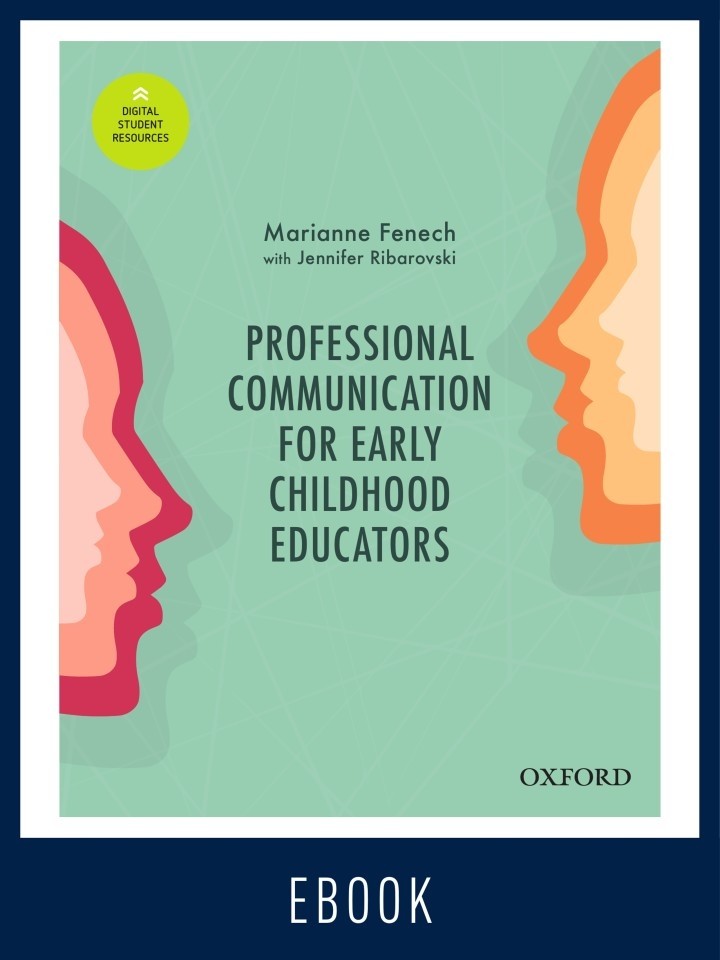 Effective interpersonal and workplace communication in everyday practice. This eBook puts professional communication at the forefront of practice for all early childhood educators. Quality early childhood education requires educators to develop strong relationships with children, families, colleagues, and professional and community stakeholders. Effective interpersonal and workplace communication is integral to building and maintaining such relationships. Being an effective communicator is fundamental to the work of an early childhood educator but students often graduate lacking skills such as active listening, assertiveness and showing empathy. This book assists students in learning these skills as they prepare to become effective communicators in their everyday practice, while also supporting practicing educators in improving their communication skills. It is designed to support educators to develop and reflect on their interpersonal and workplace communication skills, enabling them to practise as intentional and effective communicators in complex and dynamic teaching environments. Key Features Reflection boxes encourage students to reflect on what they have learnt – these can be used to work through individually or as a group in tutorials Includes links to the National Quality Standard and the National Quality Framework Examples and scenarios are taken from real-life experiences of educators from ECEC services across Australia Videos of professional communication skills in action prompt students to reflect on key concepts discussed and consider these in their own contexts Spotlight on Communication case studies provide practitioner profiles, detailing practitioners’ experience working in the sector and how their practice relates to professional communication.