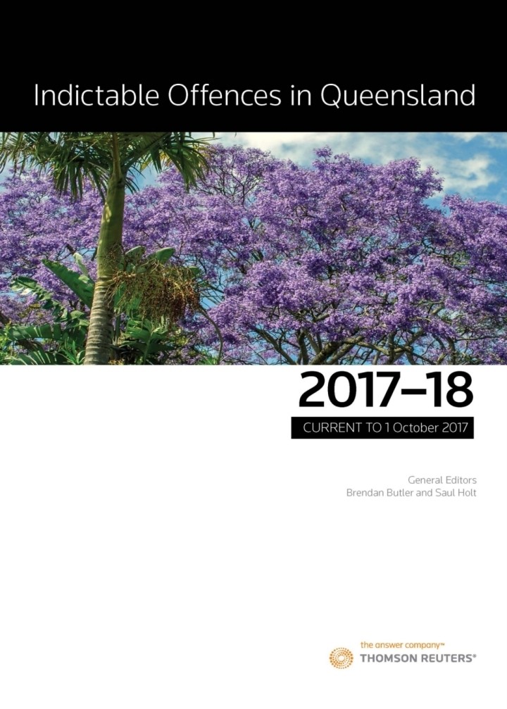 ndictable Offences in Queensland provides barristers, solicitors and judges with clear, concise guidance on the law governing serious crime in Queensland. This portable volume is designed to help users quickly find the most appropriate access to the content they need. It might be through the consistently structured annotations to the Criminal Code and other key legislation relating to topics such as drugs, bail and sentencing. Alternatively, it could be through the Thematic Overview which takes practitioners sequentially through a matter, with cross-references to Code provisions and includes commentary which does not logically sit within the Code and could therefore be more difficult to grasp with reference to the annotated legislation alone. Current to 1 October 2017, this accessible treatment of Queensland criminal law is written by expert barristers working in conjunction with General Editors Judge Brendan Butler and Saul Holt QC. A powerful combination of substantive expertise and practical understanding of the law in operation, Indictable Offences in Queensland will appeal to practitioners of all levels of expertise as well as students.